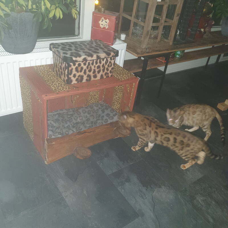 Papa & Mama vinden het maar vreemd zo'n vreemde "bak" in de woonkamer. Voorzichtig maar even onderzoek. En ik hoop dat moederpoes dit plekje opzoekt om te bevatten als ik niet in de buurt ben. FINGERS CROSSED dat ik er wel bij ben natuurlijk!!