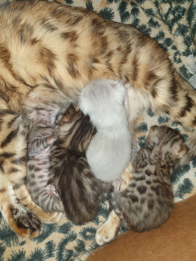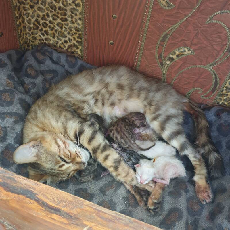 Wat ben ik blij! Luna is bevallen van 4 prachtige kittens! Als eerste werd er een prachtig Snow katertje geboren! Hierna volgden 2 Black tabby spotted katertjes en 1 Black tabby spotted poesje! En allemaal weer helemaal gezond. Dit word weer genieten de komende tijd!!