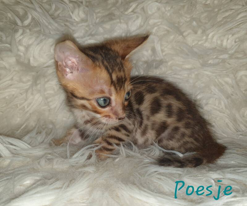 De kittens zijn nu 7 weekjes en 3 dagen jong. Ze beginnen nu hun eigen karaktertjes te ontwikkelen. Dit poesje is de kleinste van het hele stel en komt erg graag lekker bij je in de nek of op schoot liggen. Een echte knuffelkont dus. Meespelen doet ze graag mee en is hierbij erg actief. Echt een schatje dus.